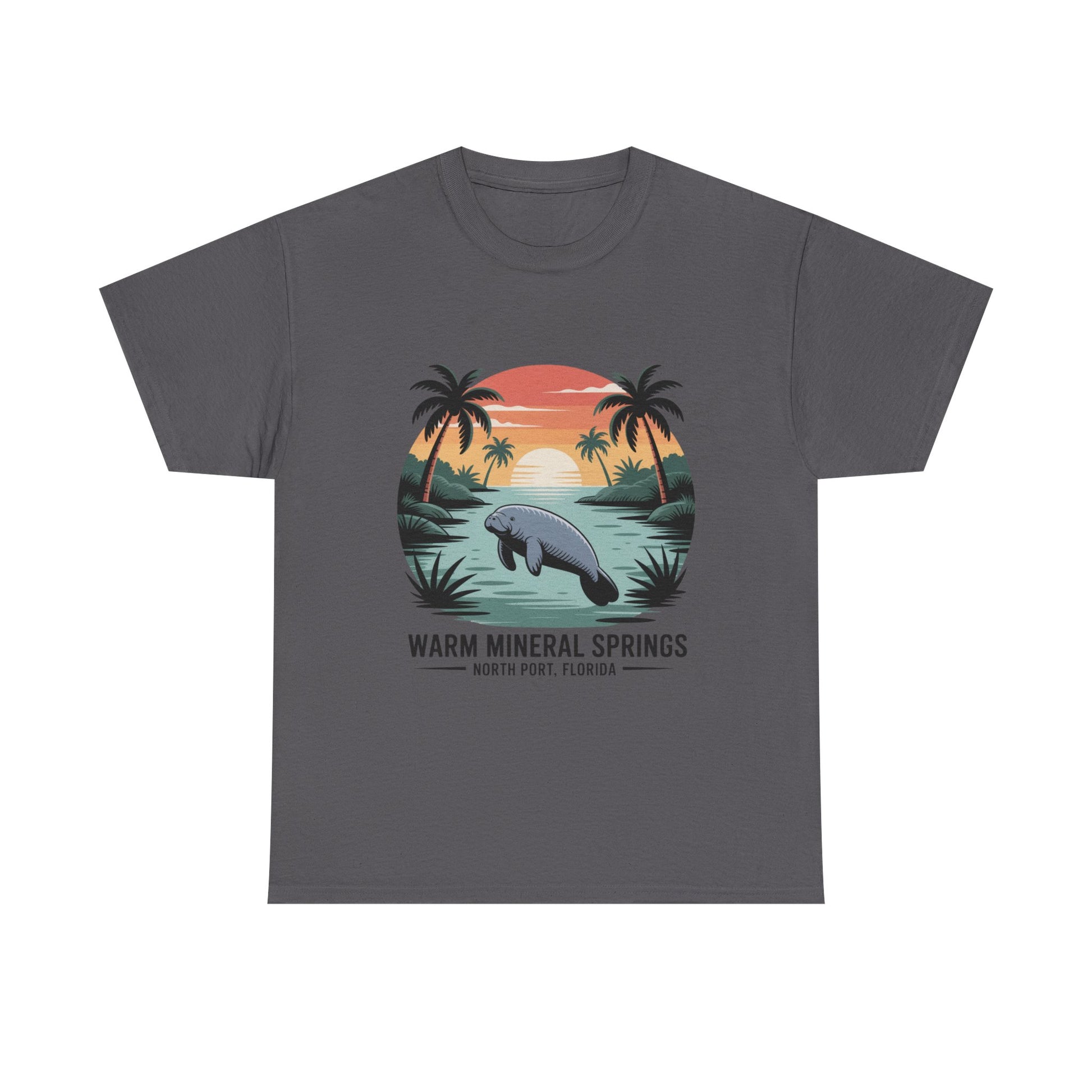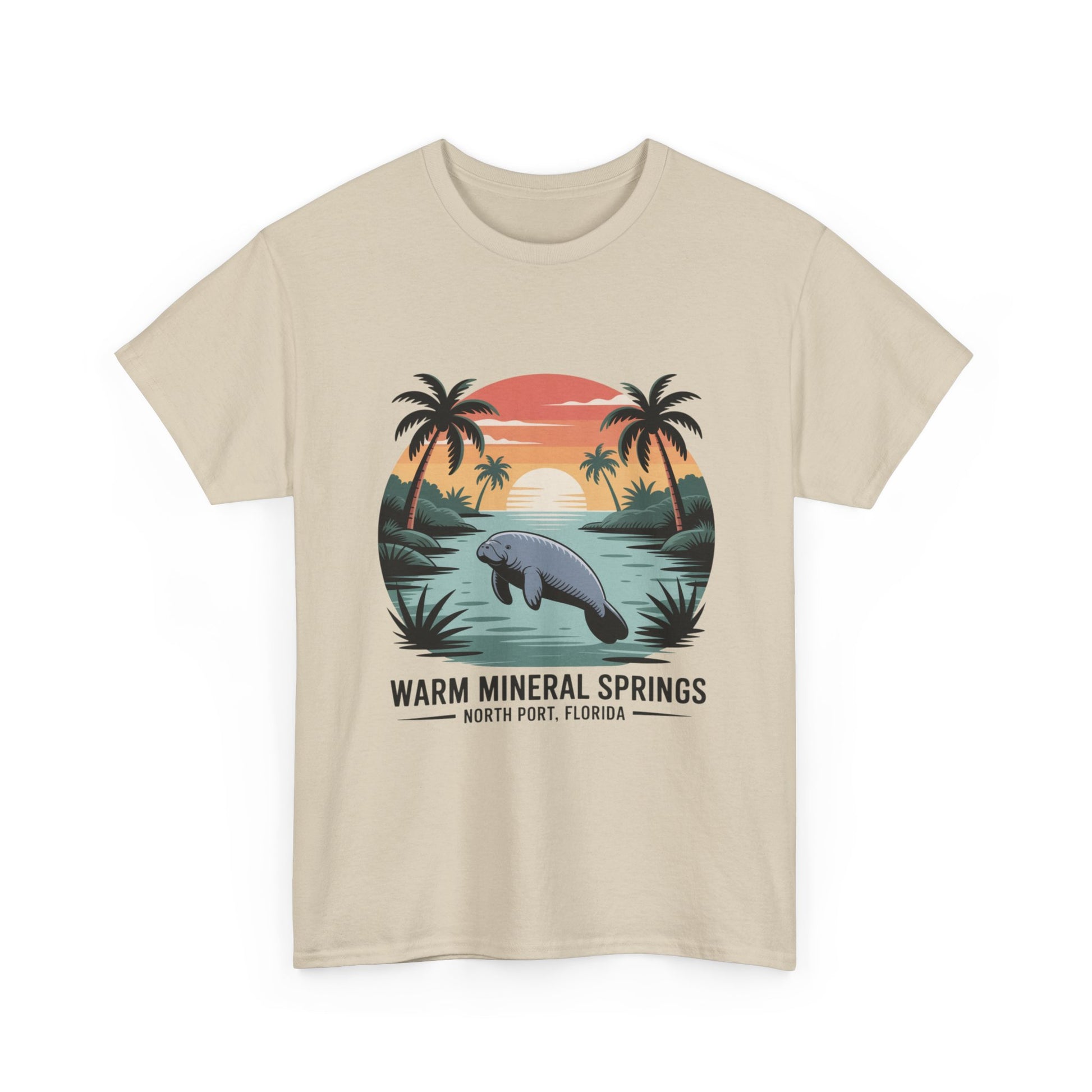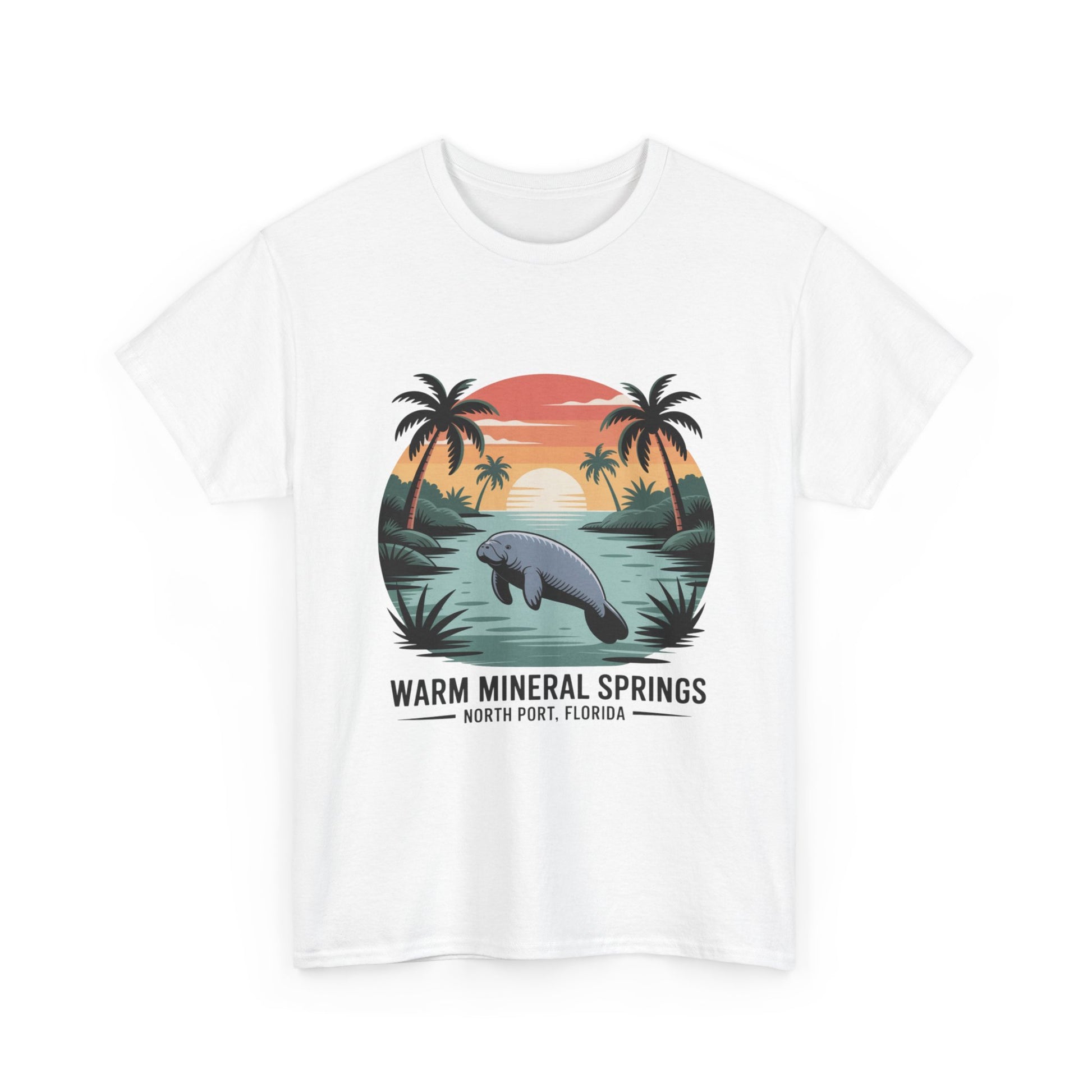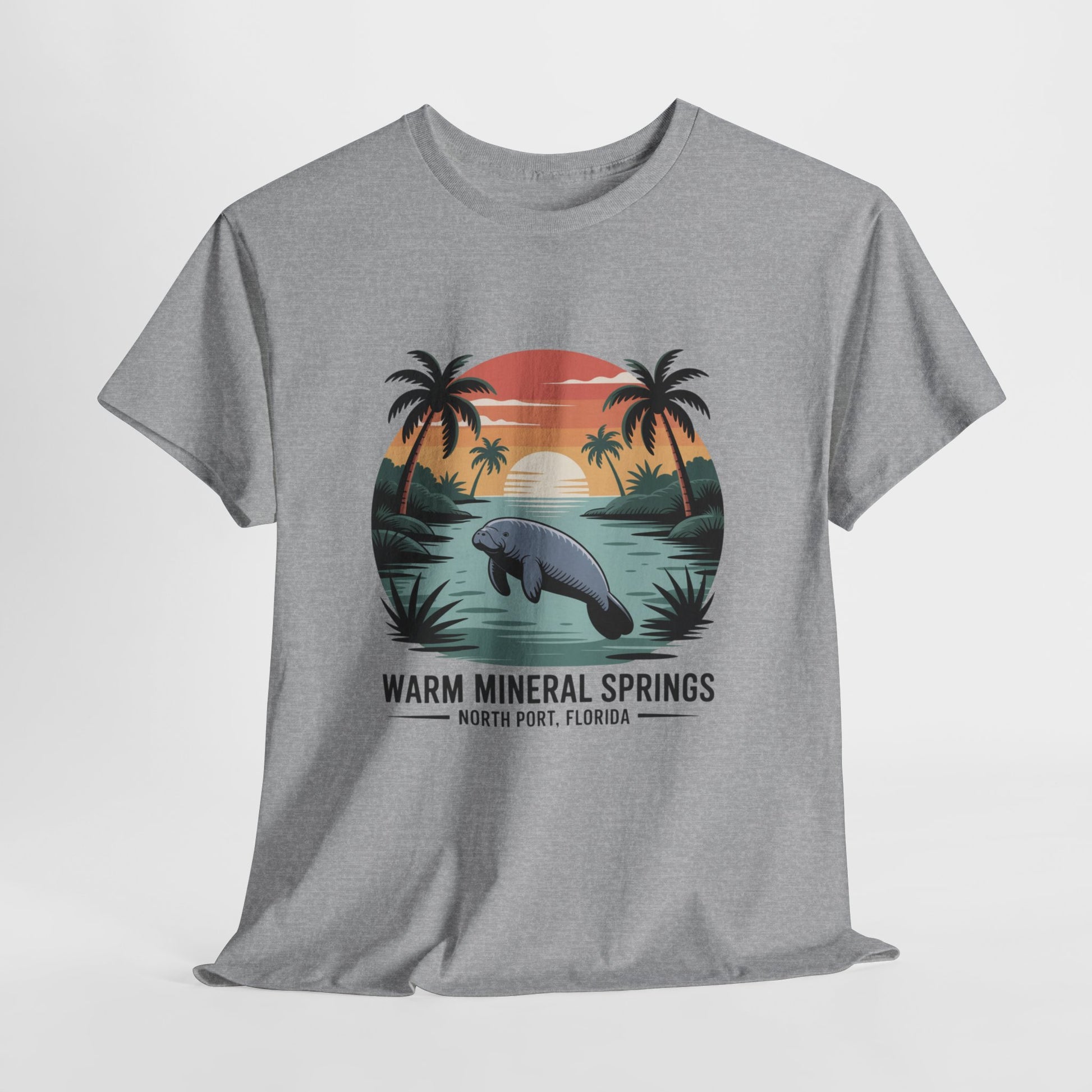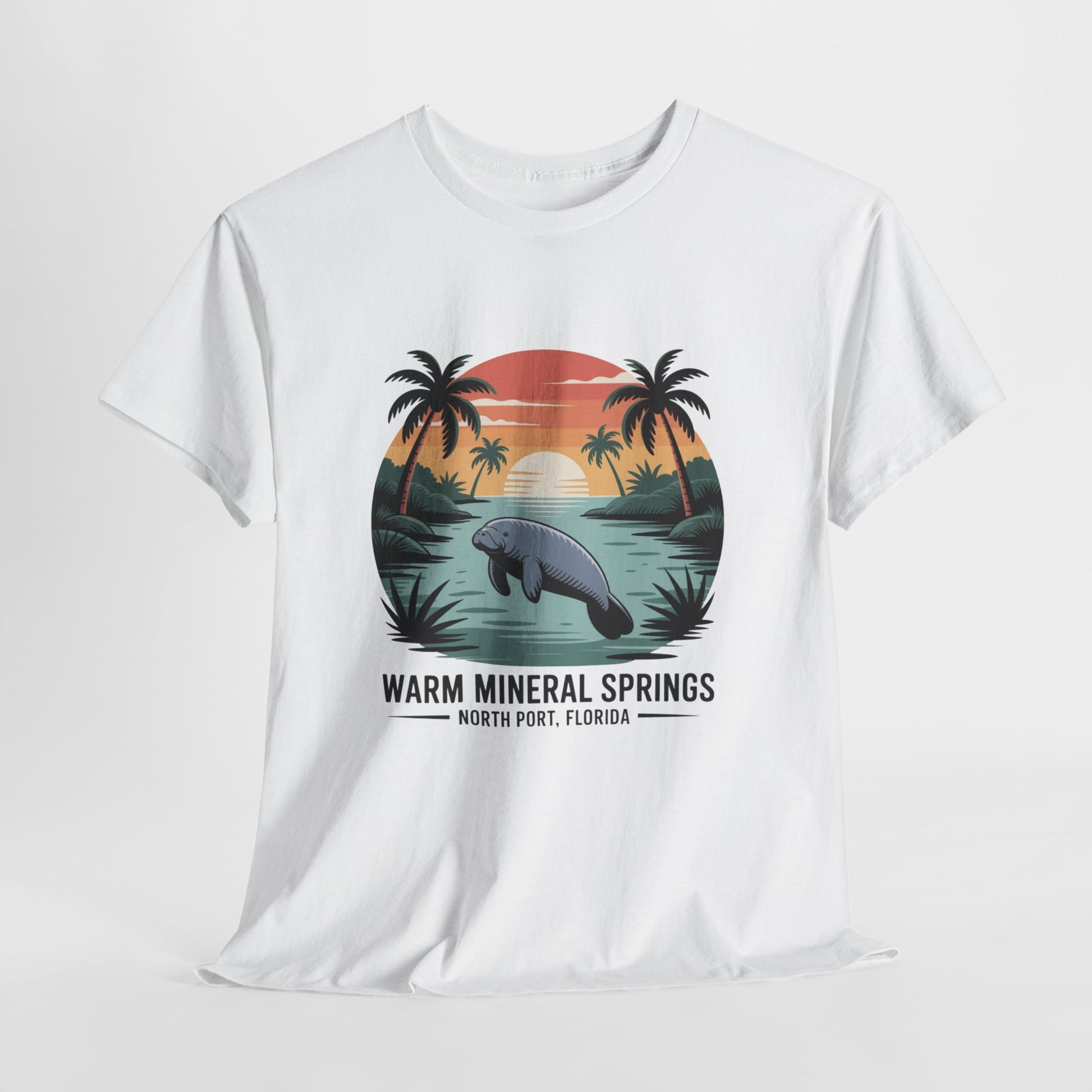 Warm Mineral Springs North Port Florida T-shirt featuring a manatee sunset scene, perfect souvenir for visitors and Florida nature lovers.