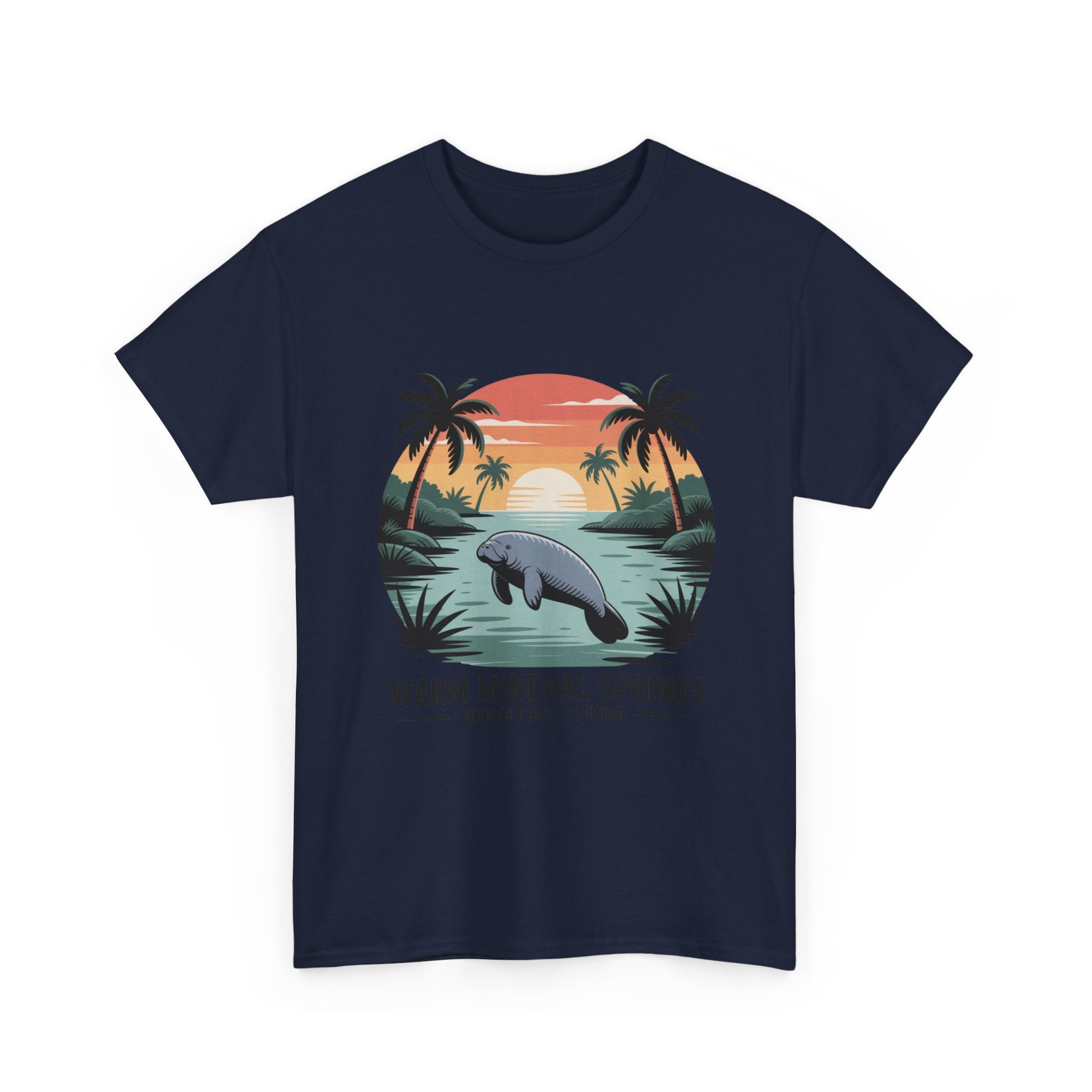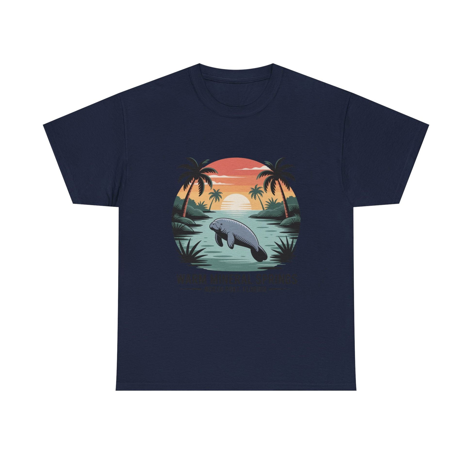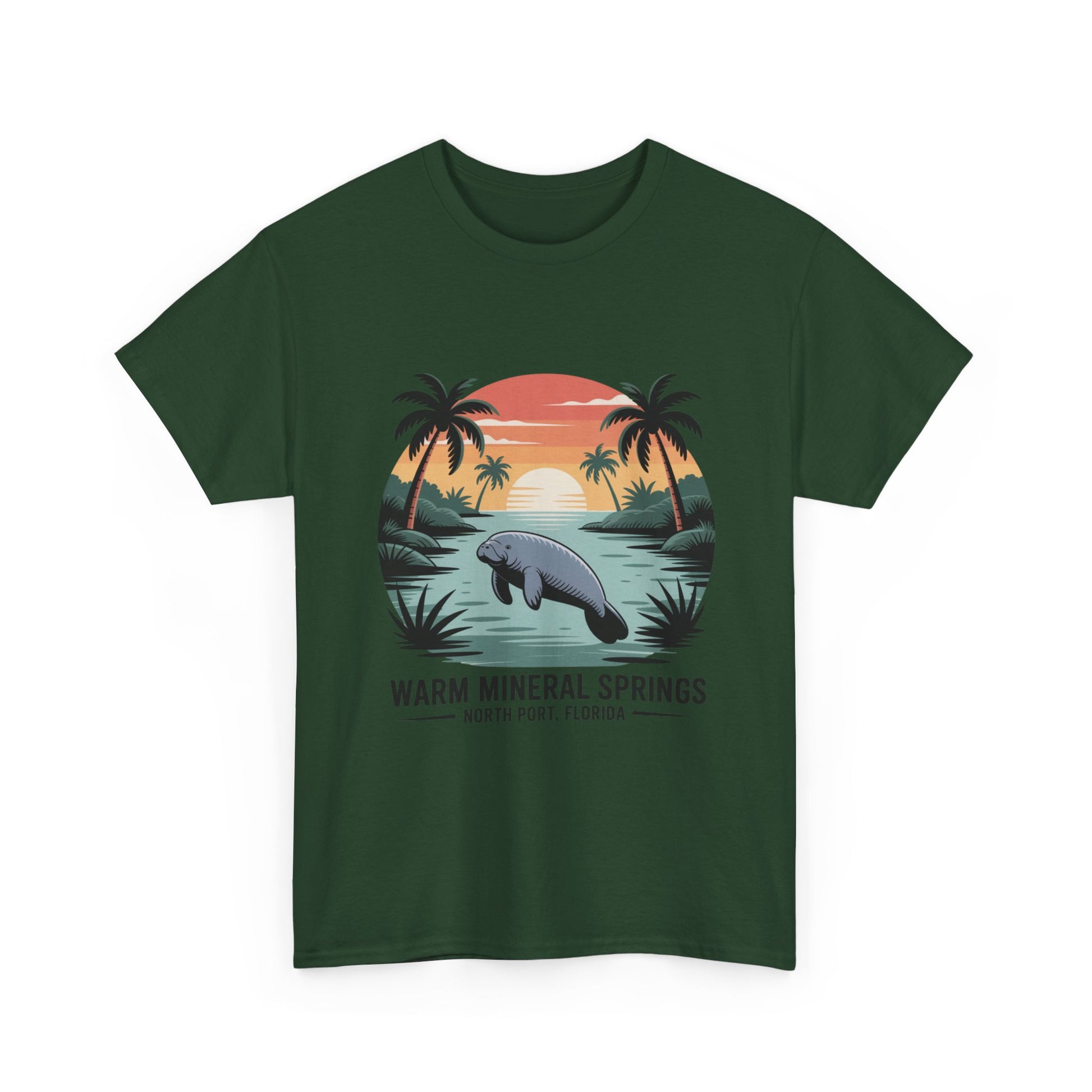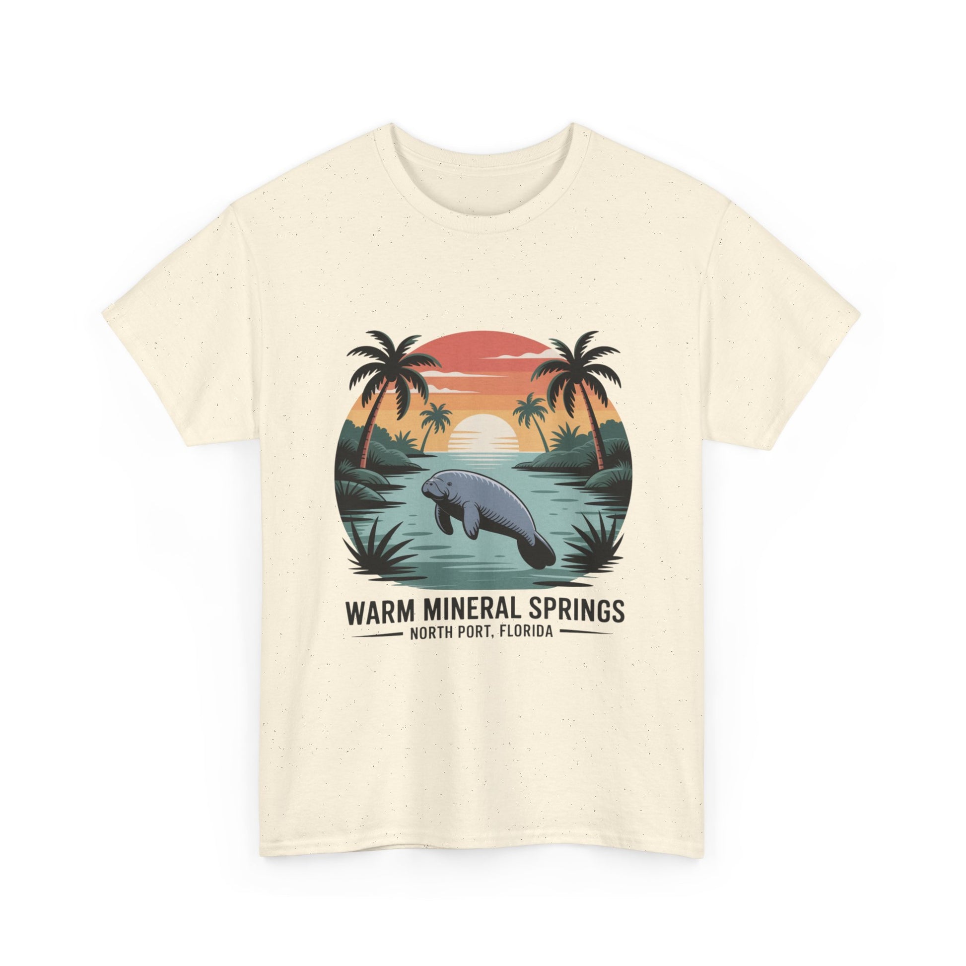 Warm Mineral Springs North Port Florida T-shirt featuring a manatee sunset scene, perfect souvenir for visitors and Florida nature lovers.