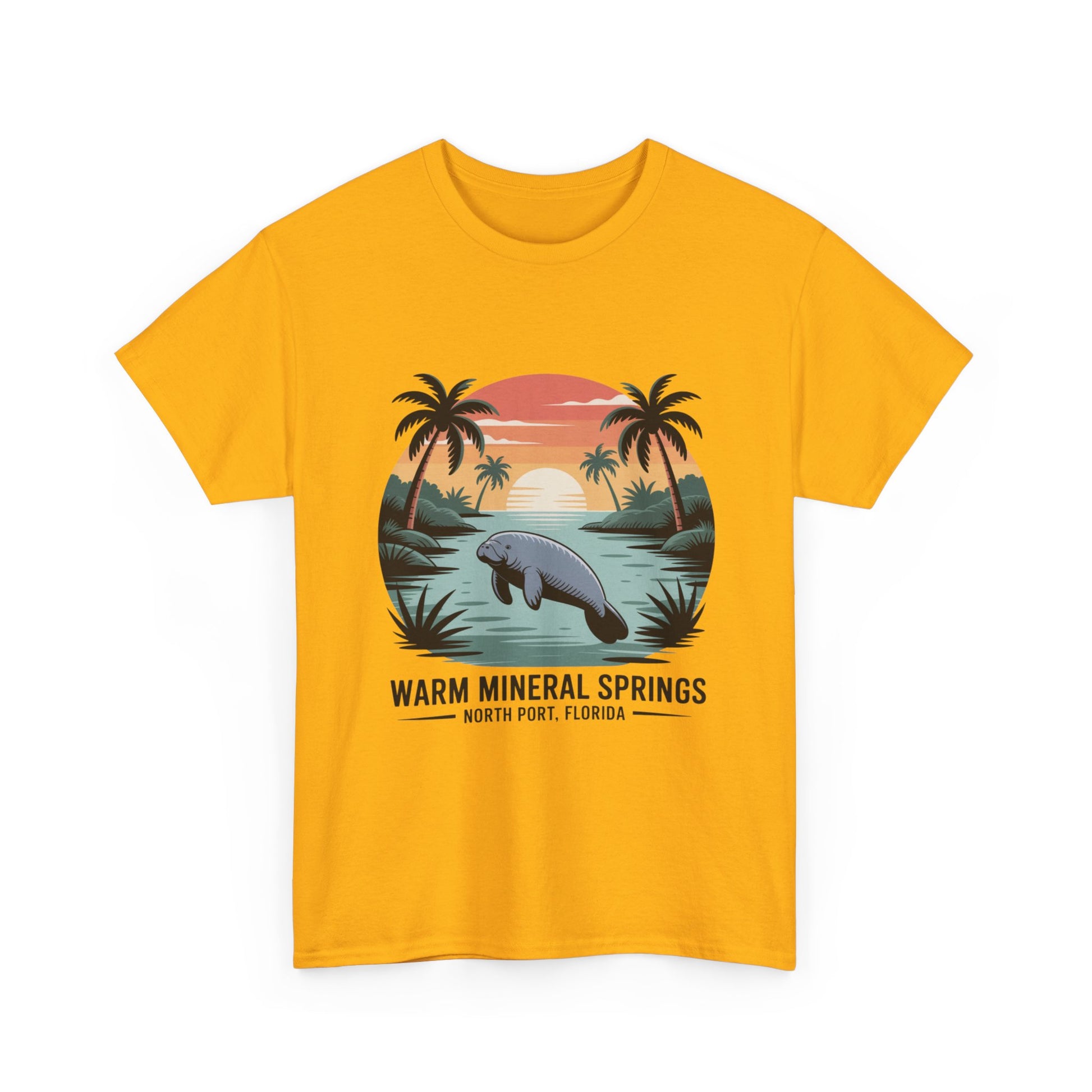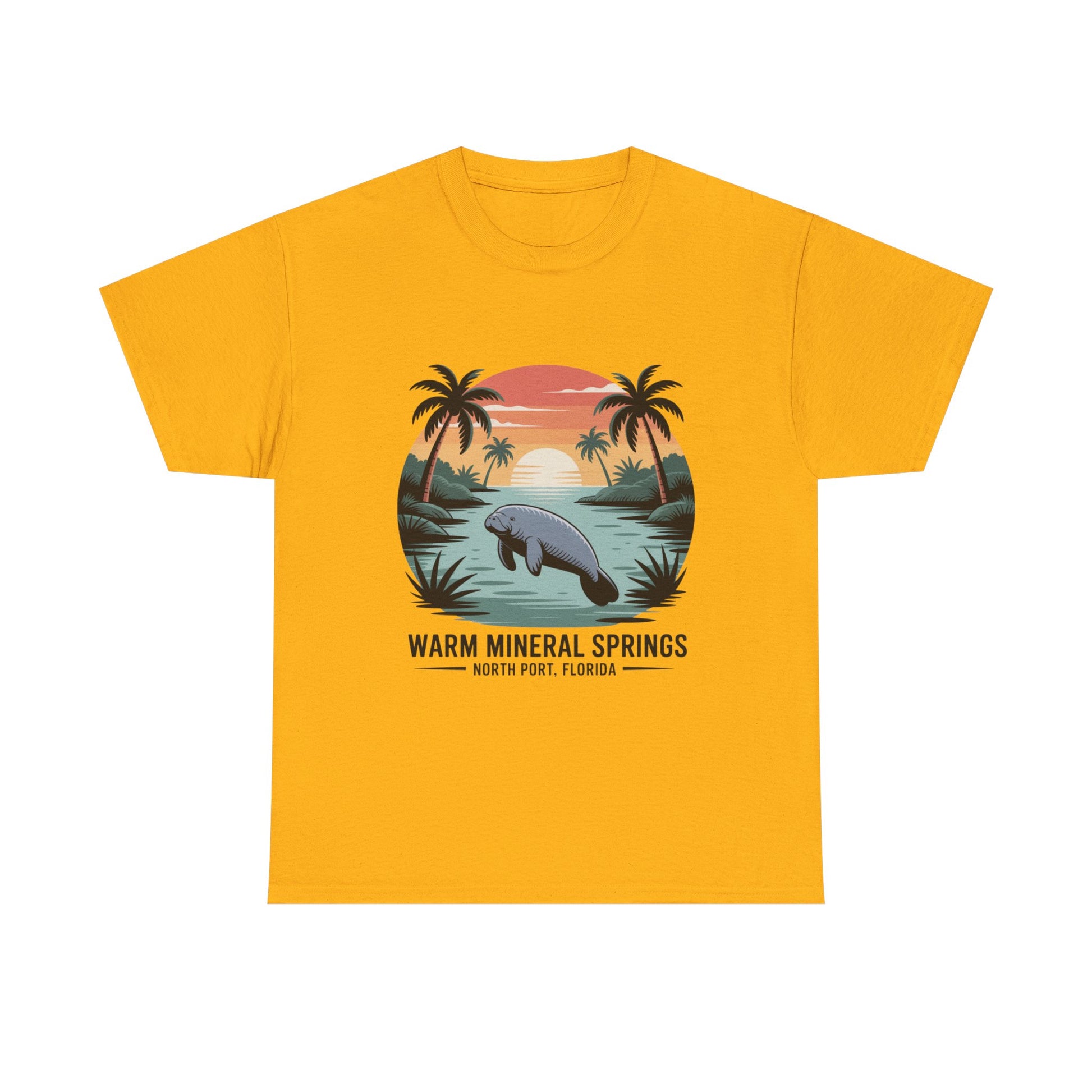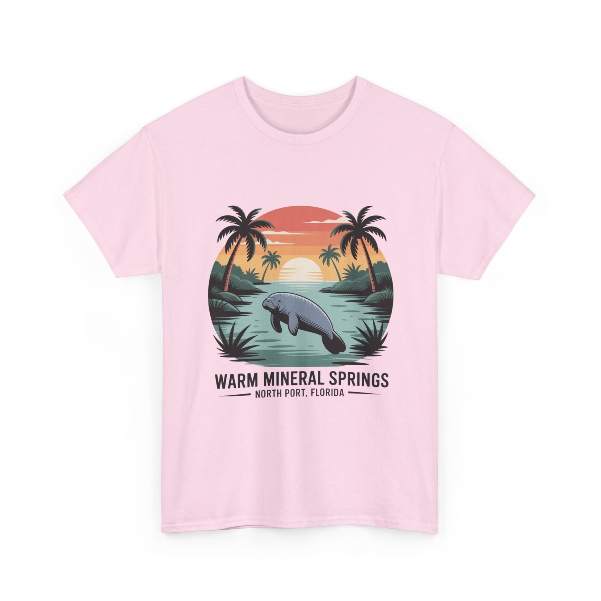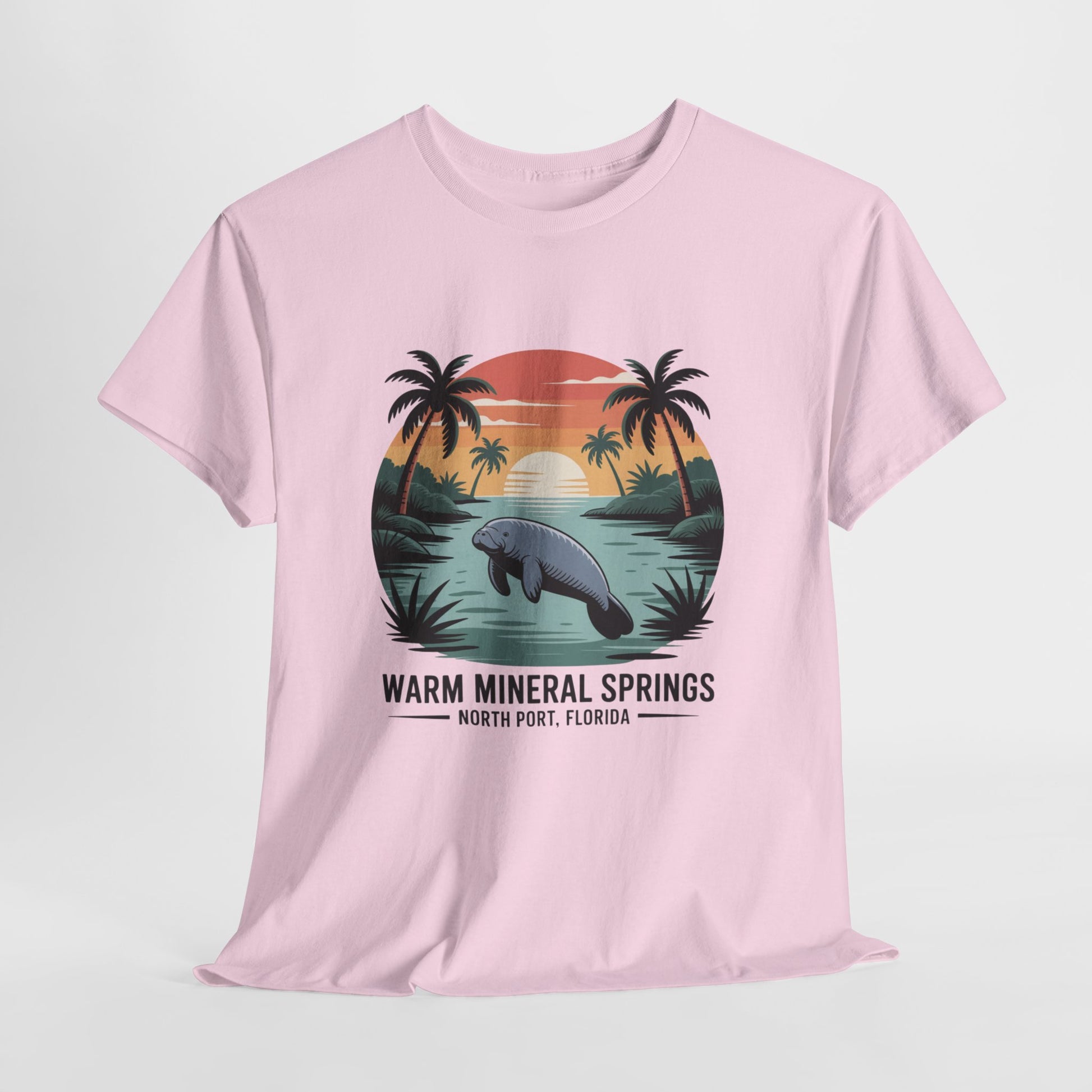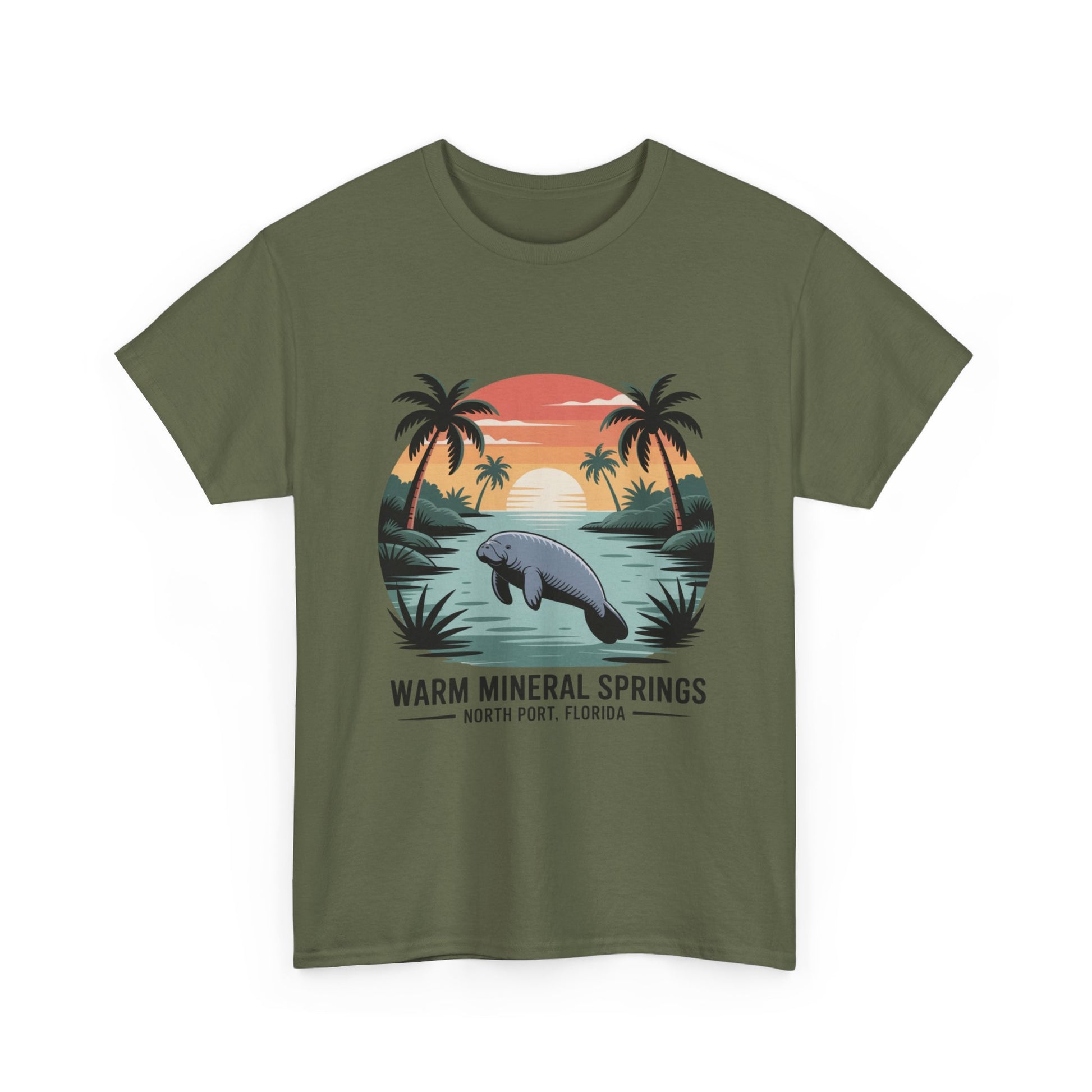 Warm Mineral Springs North Port Florida T-shirt featuring a manatee sunset scene, perfect souvenir for visitors and Florida nature lovers.
