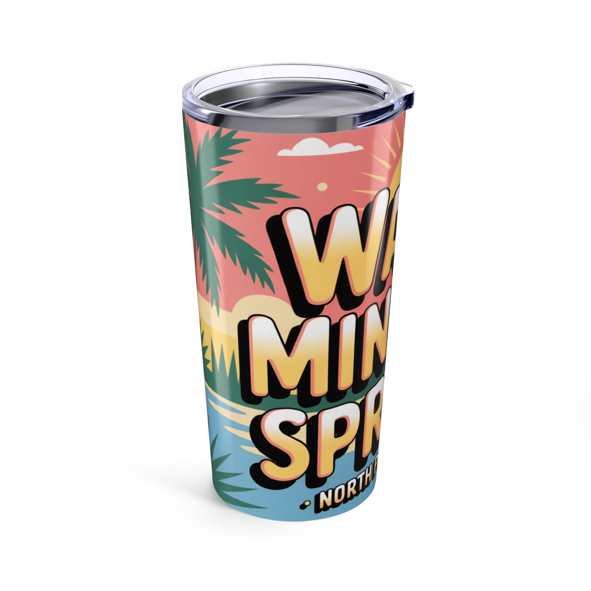 Warm Mineral Springs North Port Florida tumbler featuring a retro sunset design, perfect souvenir drinkware for visitors.
